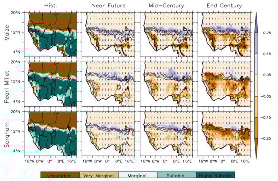 Simulated spatial suitability distribution for the cereal crops, maize pearl millet and sorghum over West Africa for the historical month (1981–2000) (column 1) and the projected change in the crop suitability for the near future month (2031–2050), mid-century (2051–2070) and end of century (2081–2100) (column 2–4, respectively). The vertical strip (|) indicates where at least 80% of the model simulations agrees on the projected sign of change while the horizontal strip (−) indicates where at least 80% of the model simulations agree that the projected change is statistically significant at 99% confidence level. The cross (+) indicates where the two conditions are met, meaning that the change is robust.