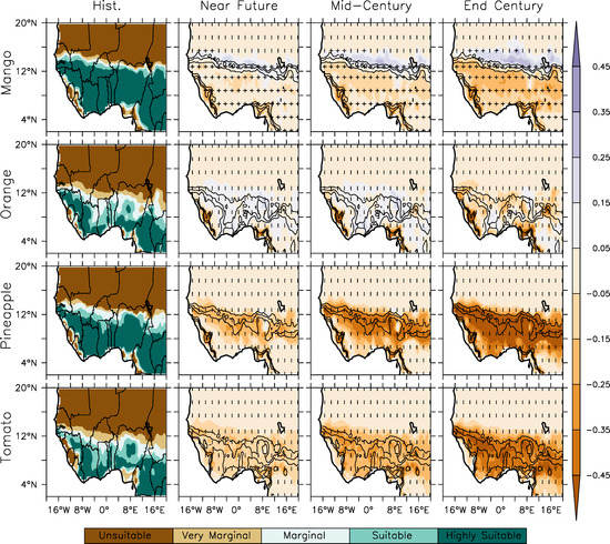 On the other hand, crop suitability due to CCD from the historical variability is projected and will lead to an increase in SIV and more suitable area notably in the Southern Sahel. The increase in suitable areas provides an opportunity for more suitable areas in the region for the cultivation of cereals, legumes and mango in the southern Sahel zone (12–14 °N), plantain and yam in the Savanna zone as well as the legume crops in the central savanna zone of West Africa. The projected increase into the Sahel agrees with the previous finding for maize in the Sahel zone with CCD. This shows that the crop spatial suitability distribution and productivity are highly sensitive to variations in the climate such that a departure of the future African climate from the recent range of historical variability will have the most devastating effect on agriculture over the continent [70,71,72].