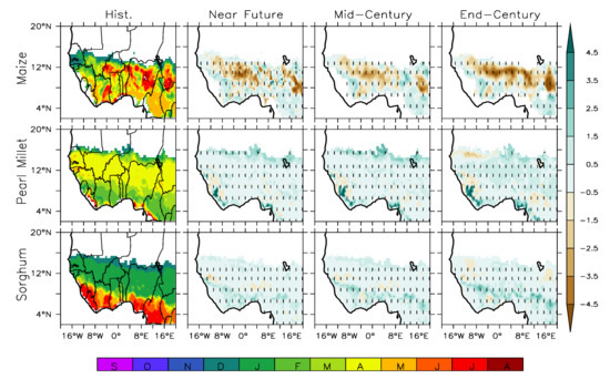RCA4 was also used in simulating the best planting months (PM) from the range of month in a planting window within the Length of Growing Season (LGS) over West Africa for the historical climate (Figure 7, Figure 8, Figure 9 and Figure 10, column 1). LGS provides information on the start and end of the growing season and can also assist in the simulation process of identifying the best PM within a possible planting window in a growing season over a given location. The simulated planting month represents the first month of the best three months of the planting window. For example, a simulation of April means April–June is the three best PM and varies with crop types across the three AEZs of the region. For the legumes, our simulation shows January–July as the planting windows for cowpea and groundnut over the region (Figure 7, column 1). Jan (January–March) and Feb (February–April) as the best PM for cowpea and groundnut, respectively in the central Guinea and Savanna AEZs except over Sierra Leone, Liberia and the south coast of Nigeria. The month of Feb (Feb-April) was simulated as the best three planting months in the western and eastern Savanna-Sahel AEZs for cowpea, while it was Mar (March–May) over the same area and month for the groundnut. Along the coastal areas, July is simulated as the PM along the southwest coast from southern Sierra Leone to Liberia and the south coast of Nigeria and April along the southwest coast of northern Sierra Leone. For the groundnut, April is the PM along the west coast of Guinea, while May is the PM along the west coast of Sierra Leone and northern Liberia. August and March are the PM at the south coast of Liberia and Nigeria, respectively. The months of December and January are the PMs along the south coast of Ivory Coast to Ghana for the cowpea and groundnut, respectively.