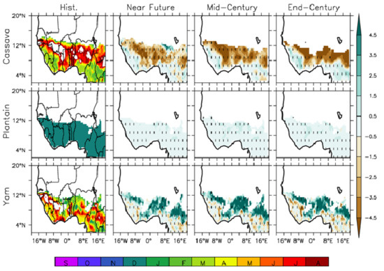 Nevertheless, the evaluation simulations demonstrate that (RCA4-Ecocrop) captures the spatial variation in the suitability with different crops across the three AEZs of West Africa in the present-day climate and can serve as a baseline for evaluating the changes in crop suitability under global warming at different time windows over the region. The model also captures the spatial distribution of the best planting month within a growing season for crops over the region which varies with different months of the year.