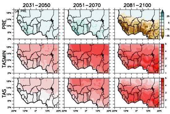 Projected changes in the total monthly rainfall (PRE), minimum (TASMIN) and mean (TAS) monthly temperature over West Africa as simulated by RCA4 for the near future month (2031–2050), mid-century (2051–2070) and the end of the century (2081–2100).
