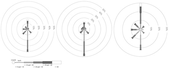 Wind rose diagrams for (from left to right) November, February and May. 3:00 pm. Adapted from Australia Bureau of Meteorology [41].