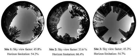 Figure 3 shows the variations in the design of these three sites using sky view factors (SVF) as a design descriptor [43,44]. The SVF was quantified by calculations of the ratio between obstacles and total vertical horizon using 180° fish-eye images. The images were taken using a Canon EOS 6D SLR camera which was fitted with a Canon EF 8e15 mm f/4 L Fisheye USM lens. The SVF percentages were calculated through Rayman Software [45]. As shown in Figure 3, among the study sites, Site 3 has the largest value of horizon limitation followed by that in Site 2 and Site 1. The limited horizon signifies the occurrence of longer duration of shade in an outdoor space, which may also influence wind sensitivity of outdoor users.