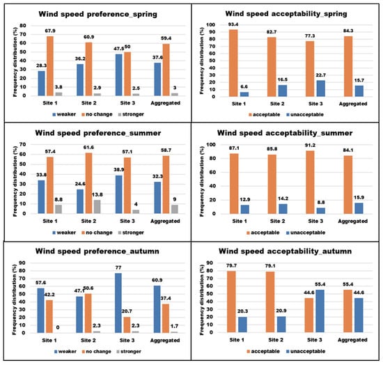 Participants’ by season and by site wind preference and acceptability votes were collected (Figure 6). The overall results showed that in the warm months (spring and summer), on average 59% of people required “no change” in Va values, whereas, in autumn this percentage declined to 37.4%. Furthermore, among the seasons the request for lower Va in autumn (60.9%) was much higher than it was in spring (37.6%) and summer (32.3%). Hence, the demand for stronger winds accounted for very small fractions of total votes (i.e., spring: 3%, summer: 9% and autumn: 1.7%). Va values were perceived equally acceptable in spring and summer with about 84% of people expressed their acceptance with current conditions. Wind acceptability in autumn, however, was found to be lower by around 29%. Figure 6 illustrates the frequency distribution of wind comfort perception votes.