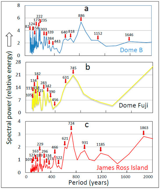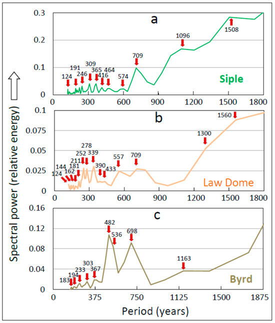 Spectral power periodograms of temperature-proxy records from three drill sites over the period 21–9 thousand years before 1950 (Kyb1950) showing similar frequency profiles. (a) Siple Dome; (b) Law Dome; and (c) Byrd. Numerals within plot areas identify the period in years (y) of the corresponding spectral-density peaks marked by vertical red arrows. The time period covered, averaging bin width, Fischer’s Kappa statistic and corresponding probability that the distribution is discernibly different from white noise are (a) 21–9 Kyb1950, 60 y, 38.3, 1.8E–19, (b) 21–9 Kyb1950, 60 y, 14.2, 8.9E–6; (c) 16.77-10.02 Kyb1950, 75 y, 18.4, 4.7E–9.