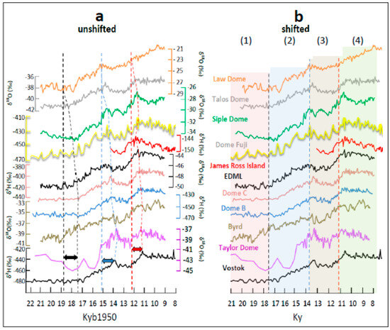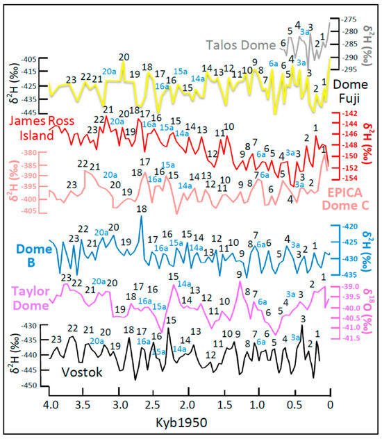 Open-access databases containing temperature proxies (deuterium, δ2H (‰) and oxygen, δ18O (‰)) from Antarctic ice cores were downloaded from the paleoclimate databases published by the World Paleoclimate Data Center (WPDC), United States National Oceanic and Atmospheric Administration (NOAA) [16]. Ice-core datasets analyzed here and their sources include Vostok [17,18], the European Project for Ice Coring in Antarctica (EPICA) Dome C (EDC) (updated EDC3 age model) [19,20,21], Law Dome (LD) [22,23], Taylor Dome (TD) [24,25], Talos Dome (TALDICE) [22,23], Siple Dome (SD) [22,23], Byrd Dome [22,23], James Ross Island (JRI) [26], EPICA Dronning Maud Land (EDML) [22,23], Dome Fuji (DF) [27,28], and EPICA Dome B (EDB) [29].
