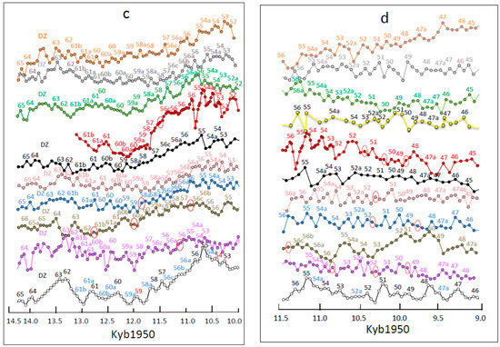 Magnification of each colored time-series panel on the shifted time scale of Figure 3b is required to identify each ACO homolog visually (Figure 4). The four time periods shown in Figure 3b, (1–4), correspond approximately to the following climate milestones in the NH: the LGM (Figure 4a), Oldest Dryas, Bølling oscillation, and Older Dryas (Figure 4b), the Allerød oscillation and Younger Dryas (Figure 4c), and the Holocene Temperature Maximum (HTM) or Holocene Climate Optimum (HCO) and early Holocene (Figure 4d). Both signpost and non-signpost ACO cycles are labeled in Figure 4, although we used identified signpost cycles for the major quantitative measurements and computations reported here (Methods). Amplitude and time scales differ for each paleoclimate record shown in Figure 4 (see Figure 4 caption) and these variables are, therefore, not directly comparable across the records contained in this figure.