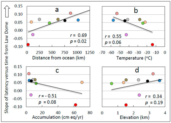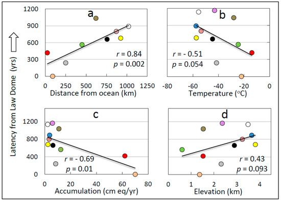A limitation of correlation analysis between latency and geophysical parameters is that the geophysical parameters are themselves mutually correlated, and therefore not independent. For example, distance from the ocean is correlated negatively with temperature (Pearson product moment correlation coefficient (r) = −0.79, p = 0.002) and accumulation (r = −0.66, p = 0.02), and positively with site elevation (r = 0.70, p = 0.02). Similarly, site temperature is correlated positively with accumulation (r = 0.78, p = 0.002) and negatively with site elevation (r = −0.93, p = 0.00001), and accumulation is correlated negatively with site elevation (r = −0.55, p = 0.01). It is therefore not possible to disaggregate geophysical influences on latency solely using conventional correlation analysis. The relative strength of correlations with latency is generally strongest for the variable of distance from ocean, however, and weakest for site elevation, suggesting that distance from the ocean may be the most influential independent variable and that site elevation is derivative with respect to possible causation.