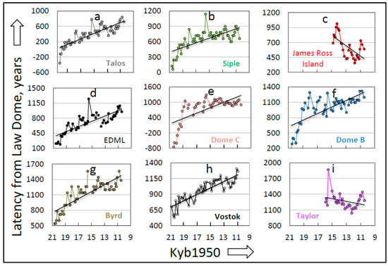 Latency between Antarctic Centennial Oscillation (ACO) homologs from Vostok to the indicated drill site (a–i) across the time period ~21–9 thousand years before 1950 (Kyb1950). Latencies here are measured in the reverse (“upstream”) direction from those in Figure 7 (see text). Trendlines are fitted by the method of least squares. Dome Fuji (DF) is omitted because sampling resolution prior to 11.78 Kyb1950 is inadequate to detect centennial-scale temperature-proxy cycles.
