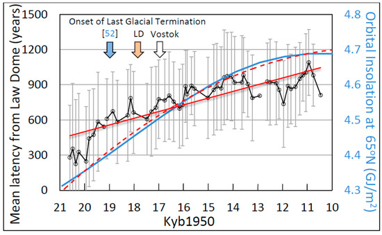 Mean latency between homologous Antarctic Centennial Oscillations (ACOs) from Law Dome (LD) to downstream drill sites over the time period ~21–9 thousand years before 1950 (Kyb1950). Vertical error bars represent ±1 standard deviation of the corresponding means computed from non-coastal latency data shown in Figure 7. The linear trendline (solid red curve) was fitted to mean latency data by the method of least squares. The blue curve shows computed insolation at 65° N for a glacial ablation threshold τ = 300 W/m2 [53,54] while the dashed red curve shows the best fit second-order polynomial curve to the insolation data (text, Equation 1). The three downward arrows show the time of onset of the Last Glacial Termination (LGT) from three different indices: sea level low-stand (blue arrow [52]), the LD δ18O temperature-proxy record (gold arrow) [11], and the Vostok δ2H temperature-proxy record [11] (white arrow).