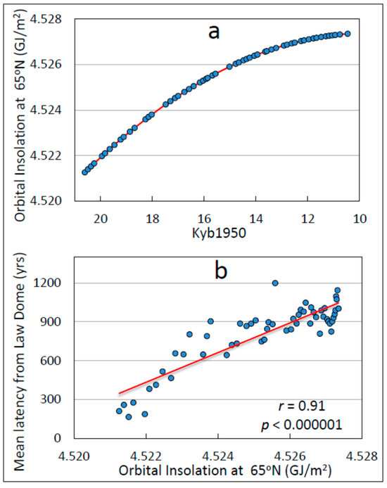The relationship between mean latency from Law Dome (LD) to all non-coastal downstream drill sites (Figure 8) and orbital insolation at 65° N [53,54]. (a) The computed second-order polynomial (Equation (1) in text) best-fit function (red curve) to orbital insolation at 65°N. The datapoints on the curve represent insolation values computed for the time of occurrence of each mean latency datapoint using text-Equation 1. (b) The regression of orbital insolation on mean latency using datapoints shown in (a) as computed from Figure 8. Orbital insolation is from Huybers and corresponds to a glacial ablation threshold τ = 300 W/m2 [53,54].
