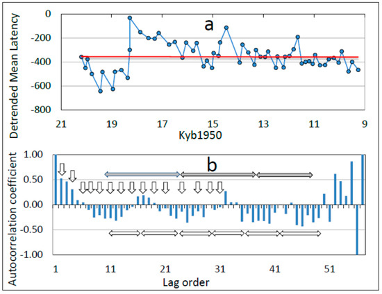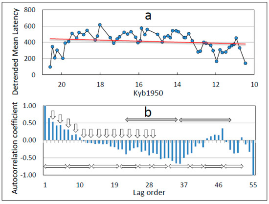 As a preliminary assessment of possible oscillatory influences on latency, we applied the same autocorrelation method used previously for a similar purpose [2], i.e., the averaged latency curve of Figure 8 was linearly detrended (Figure 10a) to enable easier visual detection of oscillatory patterns and then subjected to progressive lagged autocorrelation analysis (Figure 10b). Quantification by autocorrelation discloses at least three potential periodicities, designated by arrows in Figure 10b, i.e., short (downward arrows), medium (open horizontal arrows), and long (shaded horizontal arrows). The duration of lag order increments in Figure 10b is approximately 184 y, and the three periodicities shown therefore correspond on average to repetition periods of 350, 955, and 2489 y, respectively. These three periodicities are congruent within likely error limits with the previously-identified repetition period of the ACO of 271 y over the time period 21–9 Kyb1950 [11], the Antarctic Isotope Maximum (AIM) cycle [11] of approximately 1000 y over this time period, which is coupled with the Bond Cycle in the NH [55,56,57,58,59,60,61,62,63], and the solar Hallstatt (Bray) cycle of 2400 ± 200 y [64,65,66]. These findings suggest possible non-random cyclic modulation of latency by exogenous variables. Spectral analysis that could confirm these periodicities is beyond the scope of this study.