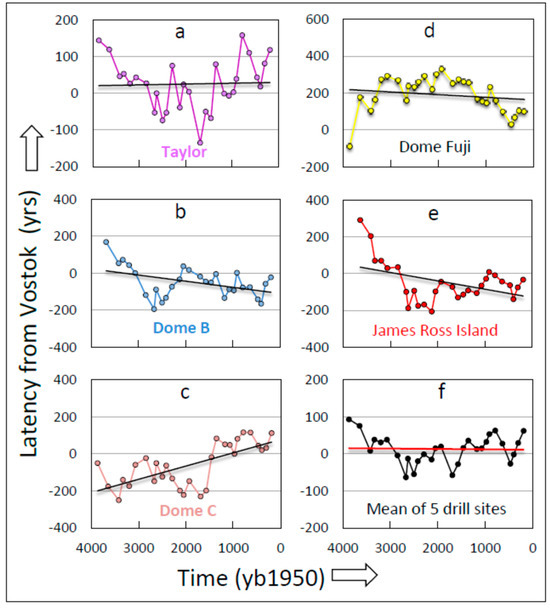 Plotting all Antarctic paleoclimate records from all 11 drill sites on the same time scale highlights graphically that ACOs at Law Dome precede their homologs at Vostok by a millennium, (Figure 3a). Conversely, ACOs at Vostok lag their homologs at Law Dome, i.e., they occur later (more recently) in time (see also Figure 2). These results demonstrate that the earliest recognizable climate events on the Antarctic continent, including identified signpost ACOs, appear first at LD. This primacy applies to both millennial-scale climate events [22,23] and centennial-scale ACOs (Figure 2 and Figure 3). The mean latency from LD to Vostok (Vostok peak minus LD peak) calculated from five signpost cycles (#73, #72, #63, #62, and #55; Supplementary Material Table S1) is −1040 y (Figure 2). A similar calculation on homologous ACOs was iterated across all ACO cycles to determine latency as used in Figure 3a and throughout this study.