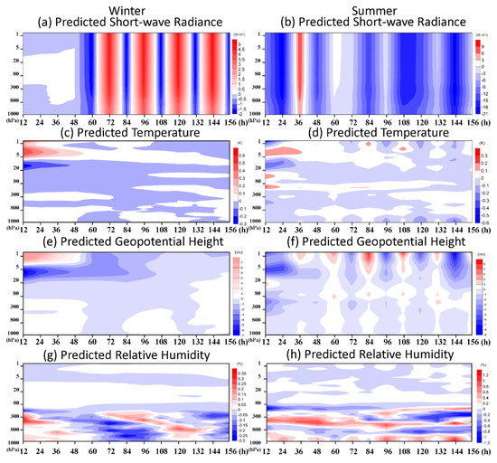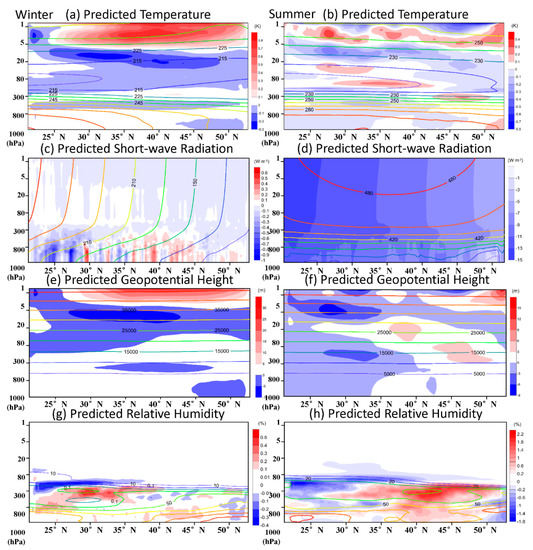 The predictions of winter stratospheric temperature are consistent with the adjusted stratospheric initials – strong upper-stratospheric warming and mid and lower stratospheric cooling are obtained (Figure 2a). A slight drop of temperature is observed in the lower troposphere at high latitudes (45°–50°N). In summer, the predicted stratospheric temperature distribution is different from the initials (Figure 2b). The predicted upper and mid stratospheric temperature show a weak wave form while warmer temperatures are predicted at lower stratospheric at low latitudes and at tropopause at high latitudes. Cooling effect is basically observed in the troposphere. The temperature changes are thought to be related to the changes in solar radiation and vertical motion of atmosphere. As shown in Figure 2c,d, the SW decreased much more in summer than that in winter due to the solar zenith angle difference. The domain averaged differences of SW radiation that reached the ground in winter and summer are −0.02 and −8.7 W m2 (~3% reduction), respectively. In winter, the relatively small changes in SW radiation (less water vapor) are responsible for the small changes in the troposphere [44]. In summer, adjusted upper stratospheric temperature between 35° and 40°N shown in Figure 1b may be related to more SW absorption by the upper stratospheric ozone layer, which leads to overall decrease of SW radiation to the lower levels. The overall decrease of SW radiation then further lead to overall cooling effects in the troposphere.