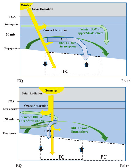 A schematic diagram of the coupled stratosphere and troposphere is shown in Figure 4. The solar zenith angle and upper stratospheric BDC are different in winter and summer. In winter, the solar radiation is much smaller due to the fact that a much smaller zenith angle. The upper BDC descends in the extratropical areas in winter while transporting air mass upward slightly towards north and then downward in the southern hemisphere (not plotted) in summer. The adjusted upper stratosphere initials shown in Figure 1 indicate that more absorption of SW radiance may have occurred in the upper BDC while less absorption of SW radiance in the mid and lower stratospheric BDC in both winter and summer. As a result, the reduced downward SW radiation reaching the ground lead to a change in temperature, GPH and further affect the regional atmospheric circulations and water vapor transport.