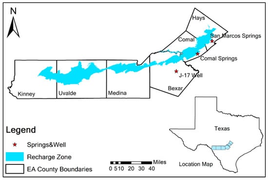 The Edwards Aquifer (EA) provides high-quality water to more than 2 million people in the Texas counties of Kinney, Uvalde, Medina, Bexar, Comal, and Hays and supplies a considerable proportion of the base flow to the Guadalupe River. The EA water supports pumping use by irrigated cropping, households, businesses, industries, and users of spring-fed rivers. Aquifer fed springs provide important habitat for endangered species []. The EA water supply relies on precipitation-based recharge, which is highly influenced by weather and adversely affected by drought.
