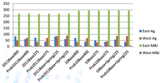 Moreover, if the M&I water demand increases by 10%, which is observed in the 10Base400, 10Base375 and 10Base+Spring225 scenarios, crop income shows greater decreases while livestock income increases slightly; however, the M&I surplus increases greatly because the water demand curves for these sectors shift outward.