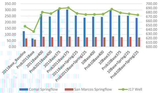 Comparison of hydrologic impacts with and without increased drought. Note: (1) Definitions of scenarios are provided in Table 1. (2) When the drought frequency is increased by 0.2, each scenario is prefixed with “Prob”. (3) “Comal Springflow” and “San Marcos Springflow” refer to the springflow in Comal Spring and San Marcos Spring, respectively (103 acre feet). (4) “J17 Well” refers to the elevation of a reference well in San Antonio (feet).
