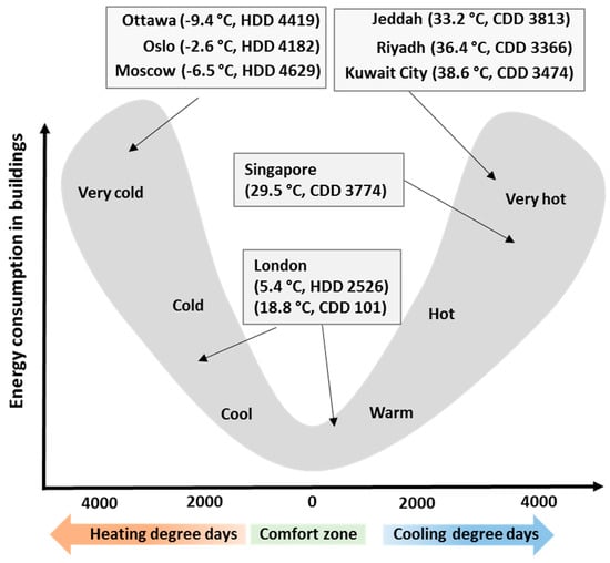 The relationship between energy and climatic conditions. Source: Authors based on ASHRAE climatic design conditions 2017 [,,]. Note: The average temperature in the hottest or coldest months are shown alongside annual cooling and heating degree days for each city. The threshold comfort zone of cooling degree days (CDD) and heating degree days (HDD) is 18 °C.