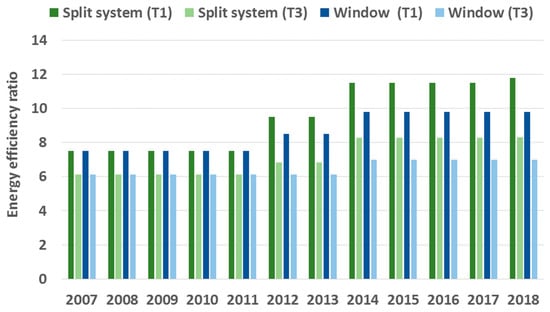 SEEC has also been steadily increasing the minimum energy efficiency rating (EER) standards of all major AC types (Figure 2). Since 2007, the minimum EER for split type AC units has risen from 7.5 to 11.8, and the EER for window type units from 7.5 to 9.8. The current EER standard for commercial chillers is 9.7, and variable refrigerant flow (VRF) is 11.2 [,]. The government has also instituted a price discount scheme for the purchase of highly efficient split system AC units with EERs of 13.8 or higher. This program offers a 900 Saudi riyal (SAR) (US $240) rebate for each unit sold, up to a maximum of six units per household [].