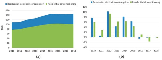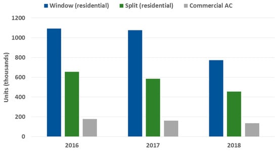 According to the International Energy Agency (IEA), over the next three decades, the use of air conditioners (ACs) is set to soar, becoming one of the top drivers of global electricity demand []. Global energy demand from ACs is expected to triple from around 2000 terrawatt-hours (TWh) today to 6200 TWh by 2050, adding the equivalent electrical capacity of the United States (U.S.), European Union (EU) and Japan combined. Between 2015 and 2018 alone, AC consumption in the world’s most 20 prosperous nations increased by around 400 TWh []. The IEA has identified this growing demand for air conditioners as one of the most critical blind spots in today’s energy debate [].