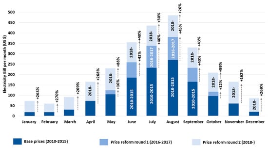 The SEC increased tariffs in 2016 and 2018 (Figure 4), passing on these higher fuel input costs to the consumer. The winter bill for an indicative household has risen from around US $20 to US $70 per month (268%) and summer bills from around $250 USD to $450 USD per month (75%) (Figure 5 and Figure A3 in the Appendix A).