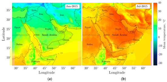 Monthly mean of daily temperature means in Saudi Arabia (2015). (a) January (b) July Source: Authors based on ECMWF ERA5.