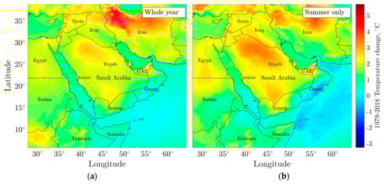 To investigate the temperature change in Saudi Arabia, the ECMWF ERA5 dataset [] has been used for the years 1970 to 2018. ERA5 is the latest and fifth generation of global climate reanalysis produced by ECMWF. The greatest advantages of this dataset include the provision of hourly data and fine spacial resolution (0.25 degrees latitude/longitude, or what is about 25 kilometres for Saudi Arabia). ERA5 reanalysis can thus be used to track atmospheric conditions at city levels and has found practical application in various climate change-related studies such as one conducted for the BBC [].