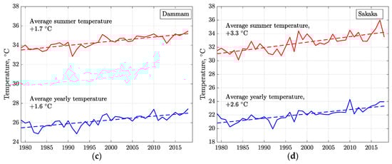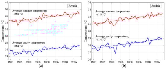 Tarawneh and Chowdhury [] assess temperature, rainfall and climate change trends using linear regression. They show the mean summer temperatures in most cities to be around 2.5 times higher in summer than in winter. Some areas in the southwest, where the seasonal difference is around 5 °C, are an exception. Using 30 years of data, they identify a warming trend for Riyadh for both summer and winter of 0.0583 °C per year and 0.0427 °C per year, respectively.