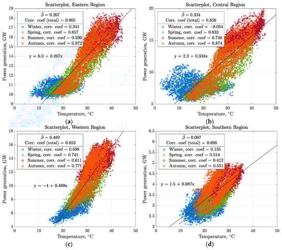 We then used OLS regression to obtain an estimate of the amount of power generation added for each 1 °C increase in temperature throughout the year in each region. We conducted the OLS analysis for each year individually and again selected 2015 for illustrative purposes (for detailed regression results see Table A2 in Appendix A). The relationship between hourly temperature and hourly power generation was highly significant in all regions with all p values very close to zero. In the summary table in the appendix we have shown the relevant t-statistic values. These indicate that the trend of linear regression is significant for all the tests at a 99.99% confidence level. While the strength of the relationship means a simple linear functional form provides a robust general result, further research could explore the evidence of nonlinearity especially in the Eastern and Central regions. It should also be noted that the values describing the level of power generation added due to temperature change are higher in each subsequent year from 2011 to 2015 reflecting the increase in overall power generation over this period.