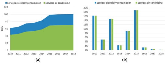 One important distinction between the hourly SEC data and Enerdata’s annual data for residential and commercial energy consumption [] is that the later is based on final electricity consumption after transmission and distribution losses. Final consumption data has an advantage over the hourly primary SEC generation data by being able to distinguish electricity use by each sector (buildings and industry). Within the buildings sector the use of electricity it is disaggregated into residential users and commercial (services) users. For example, in 2018 total final electricity consumption of 285 TWh comprised of 41 TWh used for industry (14%), 144 TWh used for residential buildings (51%) and 100 TWh used for the services sector (35%). This suggests around 86% of the total final electrical demand comes from buildings.