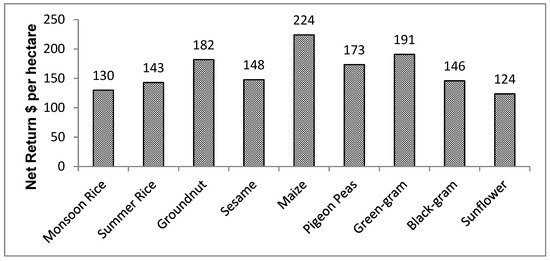The farmer’s fixed costs (i.e., non- cash cost), such as owned cattle and manure cost, their seed storage, and family labor costs were considered, and variable costs (i.e., cash cost), such as hired cattle, farm-machines and labor cost, purchased manure, fertilizer, and pesticide costs, were included in the total farmers costs for production and calculated on a hectare basic. Net revenues per hectare are calculated as the difference between revenues and costs, divided by the number of hectares farmed, see more [15]. Other socioeconomic characteristics of farmers, such as having draught animals, access to irrigation facilities, farm size, and size of households, and distance to market (accessible), were also considered. In the interview with farmers, units that prevailed in the country and region were used and the conversion rate (equivalents in SI units) are shown, as follows: one ac = 0.405 ha, one basket of husked rice = 34 kg, one basket of sesame = 24.5 kg, one basket of pigeon peas = 32.7 kg, and one basket of other pulses (green gram) = 31.3 kg, see also [18]. The current exchange rate of Myanmar Kyat (MMK) was approximately 1 $ (United State Dollars) = 1250–1300 MMK during the surveying period. A production function approach was used to generate the crop revenues of farmers. The reference period for the production data analysis was captured as one-year production cycle from pre-monsoon 2015–2016 to post-monsoon of 2016. The farmers were asked the production of major crops and the diversification of crops upon their owned land over the reference period. For the calculation of farm productivity and profit, data from the previous five years regarding costs and production of specific or major crops, such as rice (monsoon and summer), groundnut, sesame, peas and beans (pigeon peas, black gram, green gram), maize, and sunflower, etc. were acquired from the regional Department of Agriculture. The market prices of different crops at different times (previous five years) were used in the calculation to estimate the net revenue per hectare. The study only estimates the farm income obtained from the major crops. Therefore, the amount of net crop revenues per hectare of each individual farm household was obtained. The following Figure 2 presents the resulted net farm revenue of crop production ($ per ha) in CDZ. Maize and green gram give the highest return of the farmers by 224$ and 191$ per hectare, respectively. However, farmers report oil crops, such as groundnut and sesame, as their major crops and they were dominated in the CDZ see also [19].