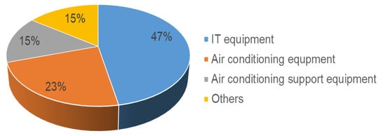 Distribution of electricity consumption in a typical DC with a Power Usage Effectiveness (PUE) = 2.1 [5].