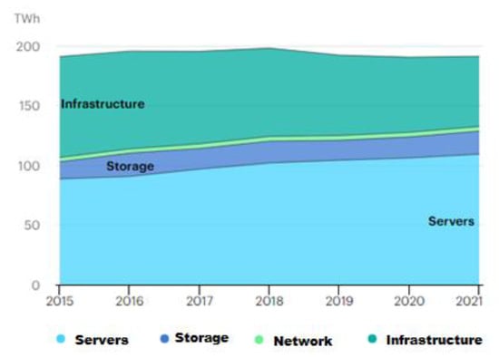 The global DC electricity demand in 2018 was estimated at 198 TWh or almost 1% of the final global demand for electricity [6]. As shown in Figure 3, based on current trends in the efficiency of the hardware infrastructure, by 2021 the global energy demand of the DC is expected to decrease slightly to 191 TWh [6,7,8,9], despite the predicted 80% increase in DC traffic and 50% in DC workloads over the next three years [9].