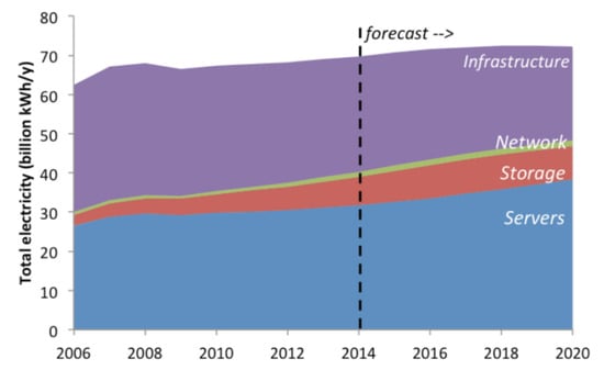 Shehabi et al. [8] estimated the historical DC electricity consumption by 2020, based on previous studies and historical shipping data. The consumption prediction was based on new trends and the most recent data available. Figure 4 provides an estimate of the total USA DC electricity usage (servers, storage, network equipment and infrastructure) from 2000 to 2020. In 2014, DCs in the USA consumed around 70 billion kWh, representing about 1.8% of total US electricity consumption. The results of that study show that electricity consumption in the DCs increased by 4% between 2010 and 2014, a major change from the 24% increase estimated in 2005–2010 and the almost 90% increase estimated between 2000 and 2005. It is expected that energy use will continue to increase slightly in the near future, increasing by 4% from 2014 to 2020, the same rate as in the last five years. Based on current trend estimates, DC in the USA are expected to consume approximately 73 billion kWh in 2020.