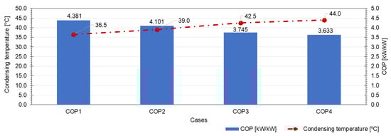The CoolPack software [18] was used to simulate the conditions of COP1, COP2, COP3, and COP4. The simulation started by condition COP4 to simulate a standard isentropic coefficient to be able to identify the COP with the variation in condensation temperatures. The effect of the condensation temperature was considered, adding 11 °C to the average air inlet temperature for each situation with the conditions shown in Figure 6. The results obtained with the software are described below for the cases of COP4 to COP1 in decreasing order. For the geothermal water condensation system, the value of 6 °C was added [11].