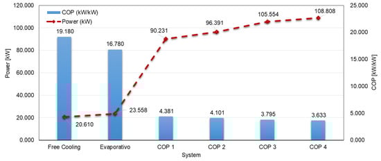 For each case study, COP is determined for two conditions, with or without the work of the fans.