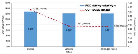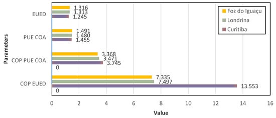 Figure 8 shows the comparative information of COP PUE COA and COP EUED. It shows that the COP EUED for Curitiba is larger than for the other cities (Londrina and Iguaçu Falls). Thus, it is the best way to map the possibilities in the project phase and have satisfactory results in the installation of new DC facilities.