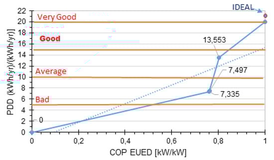 The linear mathematical equation of PDD value in terms of COP EUED is given by Equation (17), as shown in Figure 9.