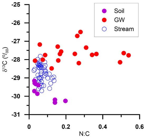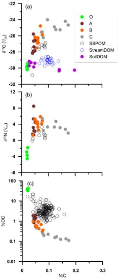 - Hatten, J.A.; Goñi, M.A.; Wheatcroft, R.A. Chemical characteristics of particulate organic matter from a small mountainous river system in the Oregon coast Range, USA. Biogeochemistry 2012, 107, 43–66. [Google Scholar] [CrossRef]
