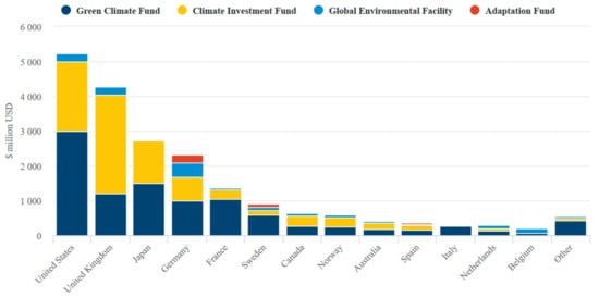 Figure 2 shows that the United States is currently the leading donor across all four funds, followed by the United Kingdom, Japan, Germany, and France, respectively, 2015 to 2018. The four funds are the Global Environment Facility (GEF), which was formed on the eve of the 1992 Rio Earth summit and comprises a partnership of 18 agencies (e.g., NGOs, MDBs (Multilateral development banks), and UN bodies) and 183 countries; the Adaptation Fund, established in 2001 under the Kyoto Protocol with the explicit mandate of finance adaptation and resilience activities in developing countries vulnerable to climate change; the Climate Investment Fund, established in 2008 and a major distributor of funds over the past four years; and the Green Climate Fund, established at COP17 in 2011, with a mandate to specifically leverage climate finance towards the US$100 billion pledge, is the key financing vehicle of the UNFCCC [46,47,48].