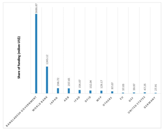 The result shows that, among the foreign donors, a few multilateral banks, and bilateral and multilateral agencies have been engaged in adaptation tasks. Among them, the World Bank was the highest contributor (i.e., 20% of the total funds); however, the Asian Development Bank supplied 4% of the total funds. Among international multilateral organizations, the International Fund for Agricultural Development, World Food Program, and GEF funded 2%, 2%, and 1%, respectively. In addition, of the bilateral donors, Japan was the leader (i.e., 4%) and channelled this aid through the Japan International Cooperation Agency, Japan International Cooperation System, and Japan Debt Cancellation Fund. Moreover, bilateral donors, such as the Department for International Development-UK, the United States Agency for International Development, the European Union, and Germany (GIZ, KFW), each participated slightly by supplying 2%, 1%, 1%, and less than 1%, respectively, of the total funds. Similarly, Norway, Australia, Switzerland, Sweden, Denmark, the Netherlands, the Spanish Trust, China, and the United Nations Development Program collectively contributed 2% of the total aid in implementing climate adaptation activities in Bangladesh.
