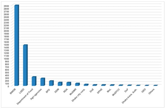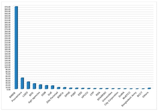 BCCT funds: Remarkably, almost two-thirds of the BCCTF schemes were implemented by the water board (Figure 5). Pourashava—a typical urban local government unit and local government engineering department—participated considerably. Furthermore, a sizeable amount was spent by the forest, agriculture, environment, and disaster management agencies (Figure 5).