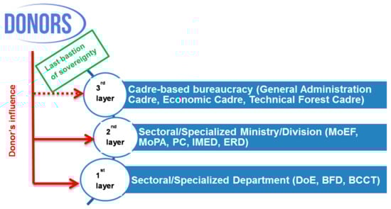 The result demonstrates that all those donors that induced policy/administrative changes that have occurred in the 1st and 2nd layer of administration shielded the veiled, exclusive, and elite 3rd layer of bureaucracy and its traditions (Figure 6). The untouched reformation has been reflected in donor’s recommendations in the validation reports and project completion reports as a potential obstacle to implementation; however, this brings no practical significance or changes at the end—after project operation. International actors might be potential beneficiaries of the system of persisting elitism in administration. The development actors, in operation, have a prior conception of the powerhouses in the administration. Subsequently, they invest sufficient attention to that power administration, create coalitions, consult with them, and convince them through formal and informal discussions before adopting a policy program. Much of this cooperation, concession, and conciliation occurs at the top level among development actors for launching and performing unhindered operations in a recipient country. Notably, some negotiations are straightforward. For example, the development actors must go through the Economic Relations Division and concerned line ministry (e.g., MoEFCC) to sign the initial agreement for operating climate projects. The rank-in-generalists of the aforementioned agencies play the decisive role in these negotiations. Although representation from the respective technical departments under the leadership of the line ministry creates some spaces for participation in the negotiation, given the intensive technical magnitude of climate adaptation dogma, the insufficient time-space to scrutinize the project documents, and the prevailing antiquated generalist dominions doctrine, this involvement does not support them effectively because, according to Agarwal (2001), this can lead to ‘participatory exclusion’ of the lead technical agency and its technicality in programmatic actions, which oftentimes creates conflicting interest and execution barriers on the ground [83,84]. Their prescriptions and interventions on climate policies might result in positive changes that help fulfil international compliance and western viewpoints; however, outside these contexts, the technocratic and top-down approaches often do not result in innovation and restrict sustainable operation, which has little impact on the ground [3,83,85].