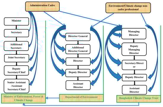 An argument could be that the central administration consists largely of three layers (Figure 6). From the bottom, the subordinate department/agency, which is working in distinct frontiers from the ministry but under the direct supervision of the latter, implements policy tasks in a particular sector at field level. At the mid-level, the line ministry makes sectoral policy decisions. Several cross-sectoral key ministries are also in this layer of bureaucracy. For example, the Ministry of Finance, Planning and Public Administration is notable, to which the responsibility for financing, planning in various sectors, and career planning of key bureaucrats is allotted. However, at the very top, an additional layer, namely, cadre-based bureaucracy, plays an extraordinarily a significant role in implementing climate adaptation policy (Figure 6). This layer structurally consists of cadre professionals, and each cadre is again divided into general and technical. Among these cadre staffs, the general administration cadre employee, commonly referred to as ‘generalists/elite’ engaging either in a ministry or a department, or at the sub-national level, exercise tremendous power and authority over policy decisions [19,35,76,82]. By contrast, the technical cadre, for example, the forest cadre, can be employed in the department, namely, the BFD, to execute forest-related policy tasks at the grassroots level. Notably, they have limited decision-making power over, for example, allocation of resources and senior staff.