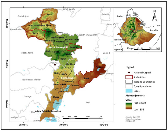Oromia National Regional State is one of the regions in Ethiopia most vulnerable to climate change and variability. This study covers three districts in Oromia region in central Ethiopia (Kembibit, Kuyu, and Boset) dominantly representing, respectively, highland (H), midland (M), and lowland (L) areas (Figure 1). This agro-ecological classification is mainly based on altitudinal variations that have a strong impact on temperature and rainfall and consequently on agricultural land uses, mainly crop production. Highland, midland, and lowland cover altitudinal ranges of 2300–3200, 1500–2300, and 500–1500 m above sea level, respectively. Kembibit district covers the total area of about 928 km2. It lies between 9°12′–9°32′ N latitude and 39°04′–39°33′ E longitude. The agro-climatic zone of the district is mainly highland (temperate) with pocket areas found in mid-altitude (sub-tropical) areas. Kuyu district is located between 9°35′–9°49′ N latitude and 38°03′–38°31′ E longitude. Its total area is 994.7 km2. Owing to its altitudinal range, the district constitutes three agro-climatic zones (temperate, subtropical, and tropical areas) with a dominant sub-tropical climate. Boset district, which covers a total area of 1514.1 km2, is found between 8°25′–8°50′ N latitude and 39°16′–39°50’ E longitude. Most parts of the area lie between altitudinal ranges of 1000–1500 m above sea level, with a dominantly tropical climate.