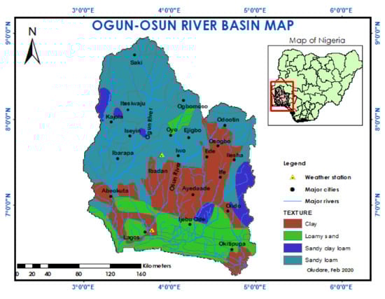 The Ogun-Osun River Basin is located in the southwestern region of Nigeria, Figure 1, between latitude 6°33’–9°00’ N and longitude 2°40’–5°05’ E with a total area of 49,580 km2. The area is characterized by a tropical climate as well as wet and dry seasons. The temperature of the region ranges from 21 °C to 34 °C and average rainfall ranges from 1000 to 1300 mm which occurs from March to September. This region is largely agrarian, and the population heavily depends on agriculture as the source of income [6]. Several studies [9,10,11,12,17,18,19,20] have shown that climate change will certainly affect the agricultural productivity. In addition, currently, there are variations in rainfall pattern within the basin, which is causing growing concern for scientists, farmers and policymakers. Also, farmers are worried about their incomes and crop yield since rainfed agriculture is mainly practiced. The soil textures within the area are clay, loamy sand, sandy clay loam and sandy loam. However, clay soil is not an agricultural land within the area, so it was not considered in the analysis of this paper.
