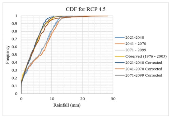 In order to correct this and to improve the performance of the model, the rainfall dataset for HadGEM2-ES was bias-corrected. Bias correction is the process of scaling climate model outputs to account for their systematic errors, in order to improve their fitting to observations [35]. The evaluation of other climatic parameters shows satisfactory results as the biases are close to zero and NSE is greater than 0.7, so they were not bias corrected. Thus, future daily rainfall, and minimum and maximum temperatures of the basin obtained from HadGEM2-ES (GCM) and RCA4 (RCM) for the period of 2021–2099 under RCP 4.5 and RCP 8.5 scenarios under the CORDEX- Africa project were used for the study.