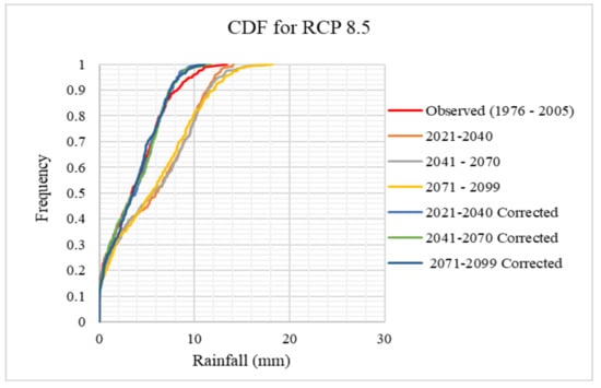 The bias correction technique applied is Quantile Mapping (QM). The principle of QM technique relies on adjusting the cumulative distribution functions (CDF) of the simulated historical GCM/RCM data based on observed historical data as given in Equation (11). It has been proved that the quality of RCM data and shape of CDF is improved through QM. Daily historical observed and simulated rainfall data from 1976–2005 (30 years) were used to bias correct the future simulated data (2021–2099).