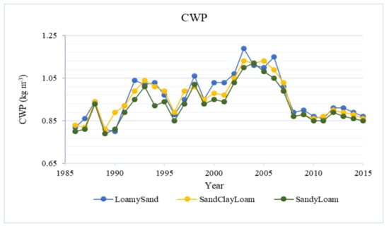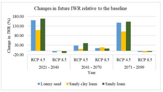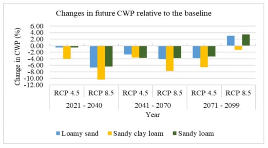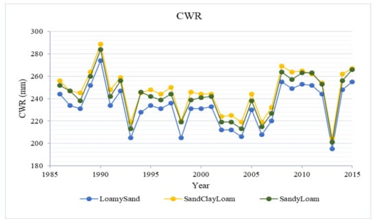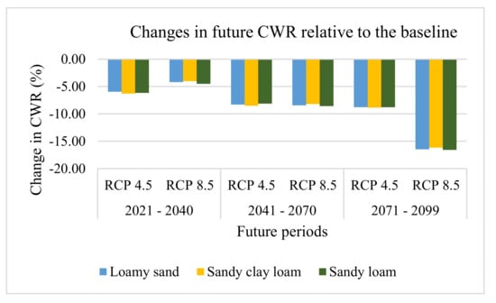 The reduction in CWR is attributable increased temperature which subsequently reduces growing days just as simulated for rice in Bangladesh and China [27]. The fact that the reduction occurred across all soil textures shows that increase in temperature and variability in rainfall is projected to reduce CWR.